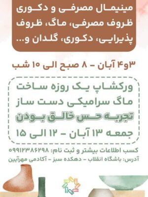 نمایشگاه دست سازه های سرامیکی لیماکپنجشنبه و جمعه 3 و 4 آبان8 صبح الی 10 شب ورکشاپ آموزشی ساخت ماگ ب...